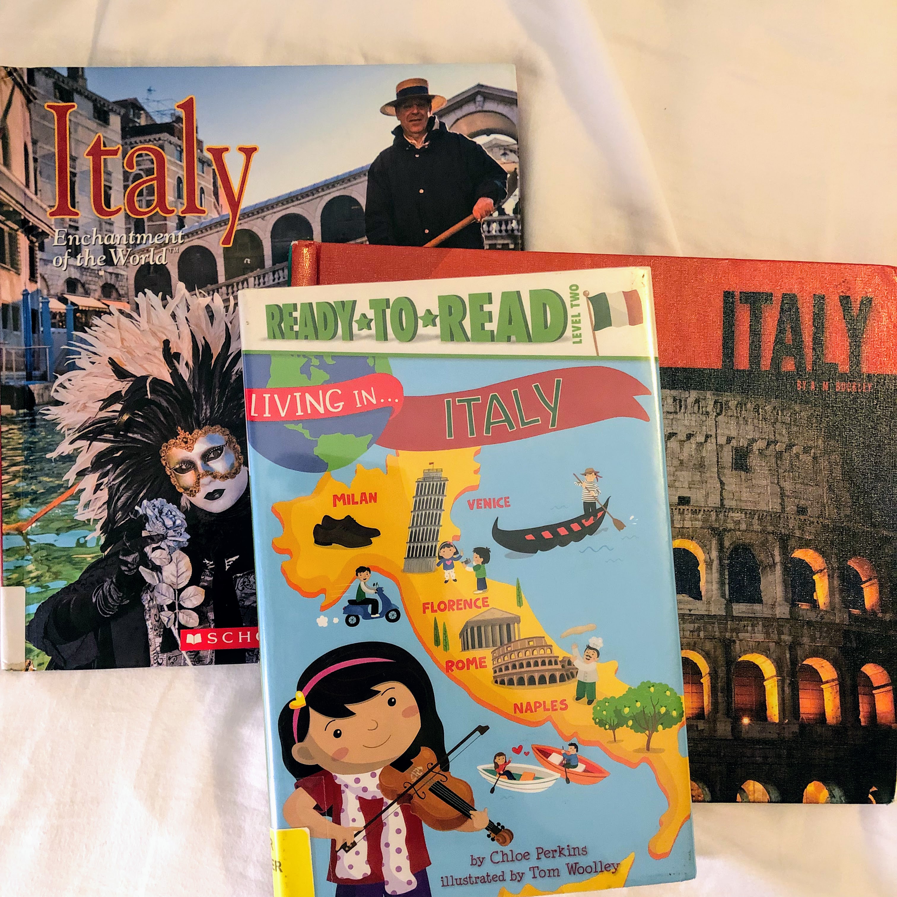 One thing I thought would help the children deal with the (small) culture shock is checking out kid friendly books about Italy from our local public library. Thank goodness our library had a few books readily available. We managed to find books about the language, the food, and history. It’s a great way for O to practice his reading, and the added bonus of having the kids give their input on what they want to get out of the trip as well.