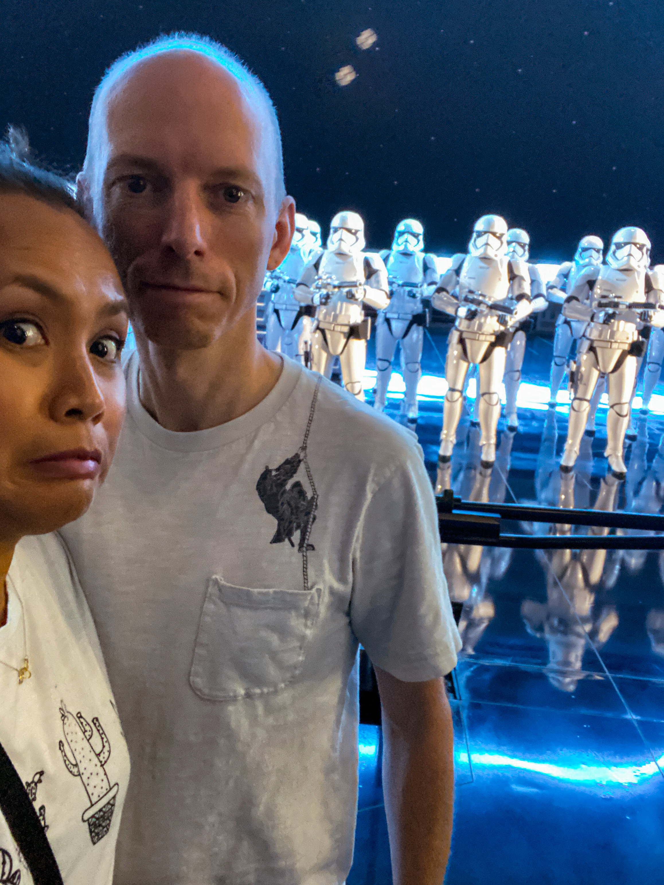 At that point it was time for us to ride Rise of the Resistance! The build up to it was pretty awesome. You are then eventually funneled into this room where a bunch of storm troopers watch you. Unfortunately for us we were stuck in there for at least 15 minutes, probably more!!! They got on the intercom to say that they were experiencing some problems with the ride. I eventually got on the Disney app to chat with a cast member because we were going to miss our lunch reservations at 50s Prime Time Cafe!!!