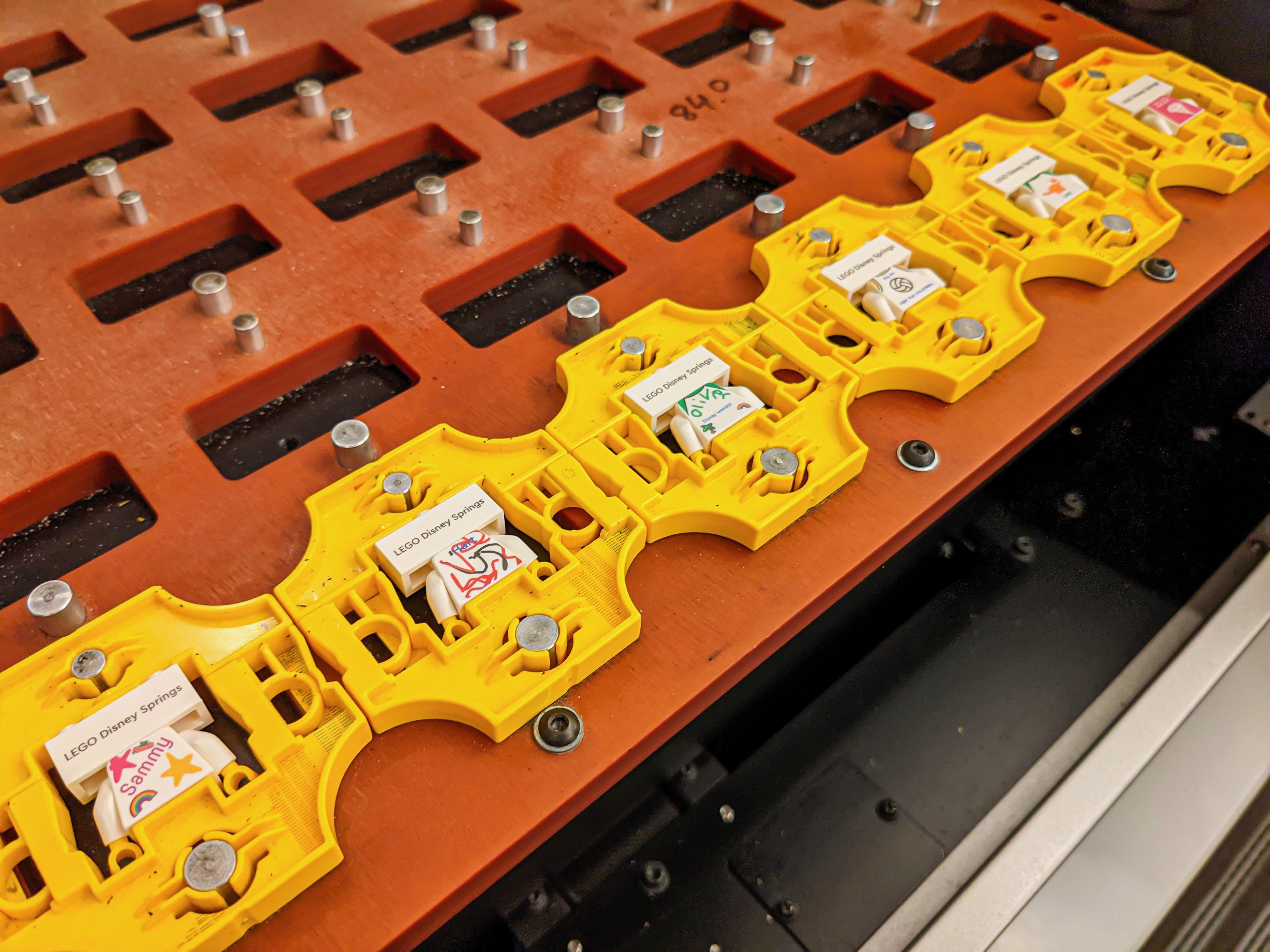 My made our way to the exit of the Lego Store to show the worker there the text to say we could do our mini figures. He let us in and we made our way to the mini figure section. After you pay they assign you a computer. There you can design your mini figure any way you want. You can pick from a collection of their stamps, you can add text with their array of fonts, and/or you can draw whatever you want on the front and the back of your mini figure. Funny enough, they don’t have any Disney specific stamps, so my kids just typed out Disney World on their mini figures. My kids were quite creative and it took them about 20 or so minutes to finish. Once you tell the computer you are done, the Lego people load up blank mini figures into a special holder thing and a giant printer prints it out. The worker there actually told us it’s a modified poster printer. While you are waiting for your mini figure to be printed, you pick out the head, hair, and an accessory. Once the printing is complete, you build the mini figure and you’re done. It was a unique experience that the kids enjoyed doing. Definitely go there first thing before you go shopping for sure.