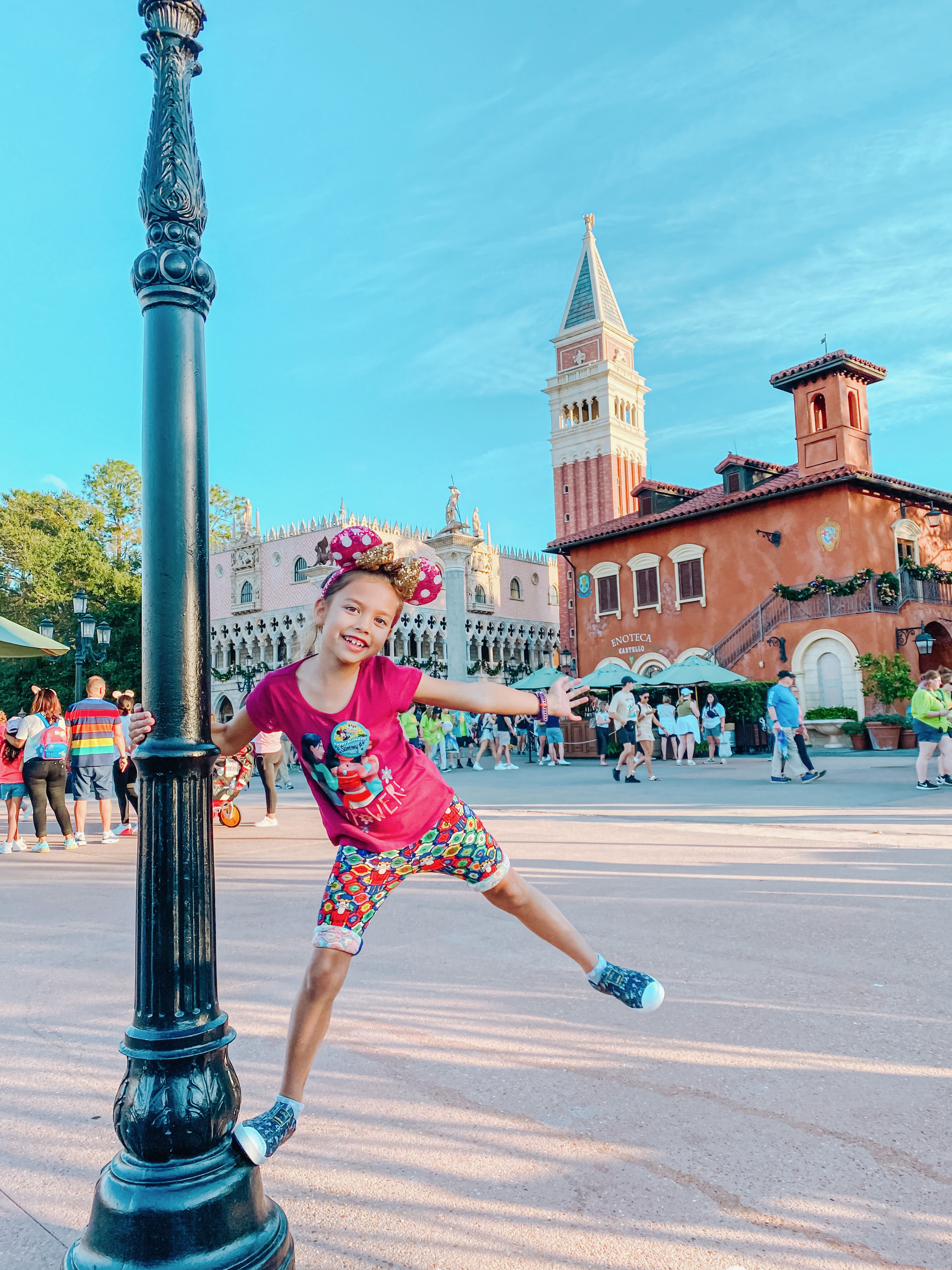 We had about an hour to kill before our early dinner reservation, so we just meander through the different countries. The kids got gelatos from Italy. My husband had a beer from Germany. If you haven’t noticed, cast members have their name and where they are from on their name tags. And at Epcot the cast members are actually from the countries they were working at. So my daughter was able to use her very very very basic Italian to order her gelato, which tickled the Italian cast members.