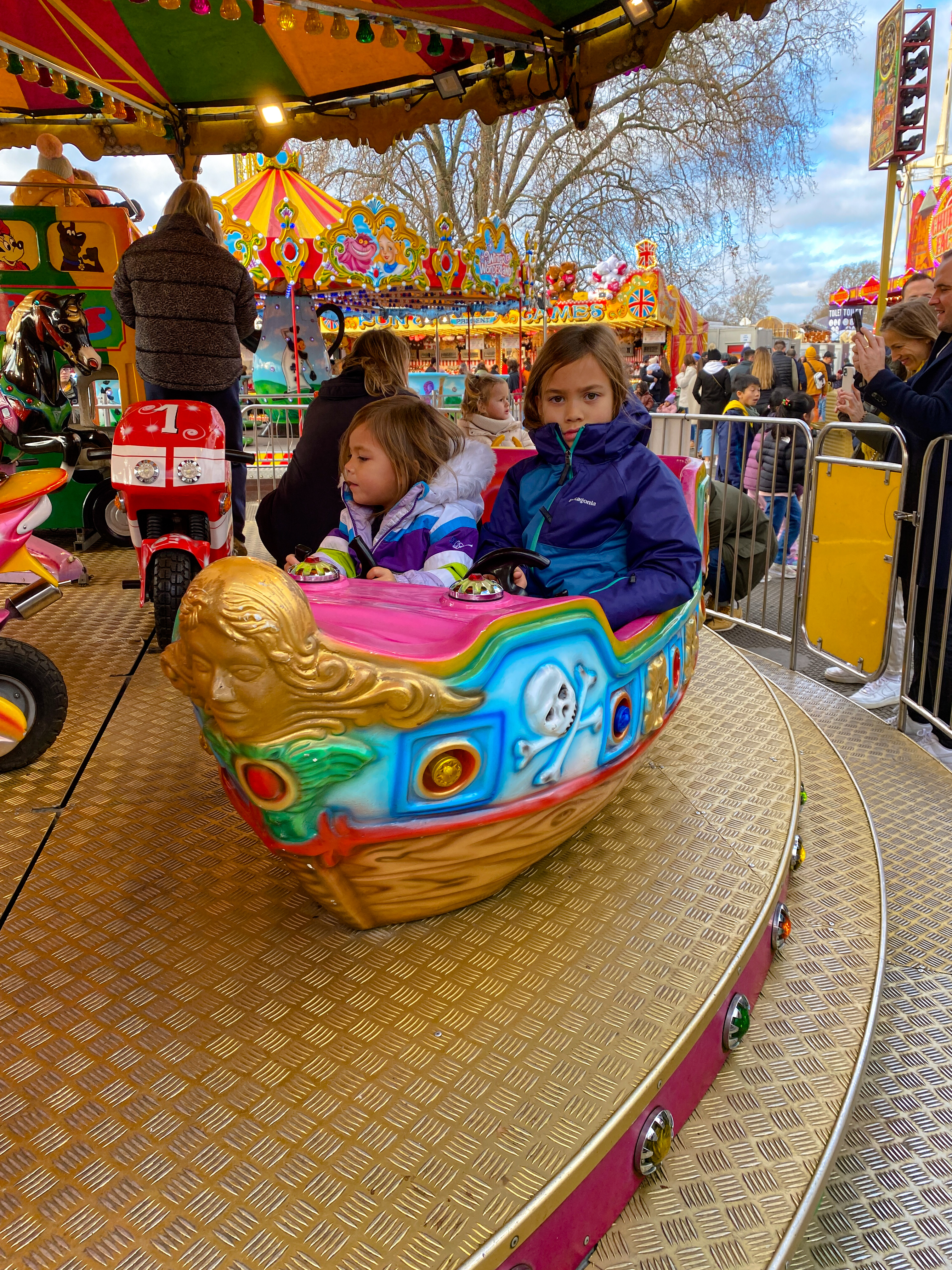 We rode the Big Wheel, which is just a huge ferris wheel that has spectacular views of London. We did two rollercoasters–the Time Machine and the Euro Coaster. I think the older kids preferred the Euro Coaster. For our 3 year old, she did merry-go-round type rides, the Santa train, and Jumbo (If you’ve been to Disney, it’s their version of the Dumbo ride). By far the cutest family ride is the Christmas tree ride. It’s not exhilarating, but how can you not go on a ride where you are in a Christmas ornament (they say bauble) as you spin around on a giant Christmas tree.